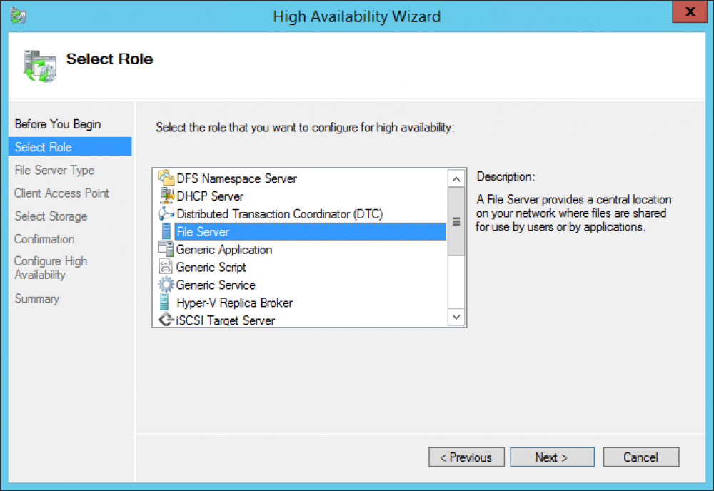 Una vez que tenemos instalado el rol en todos los servidores miembros del cluster, podemos comenzar con la configuración del rol en el cluster para esto iniciamos la consola Failover Cluster Manager luego hacer clic sobre el nodo Roles por ultimo hacer clic en la opción Configure Role…