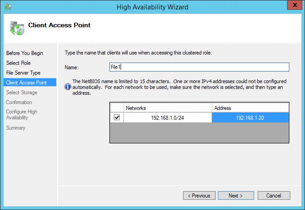 En la sección Client Access Point ingresar el nombre y la dirección IP que se usaran para identificar el cluster en la red, presionar el botón Next.