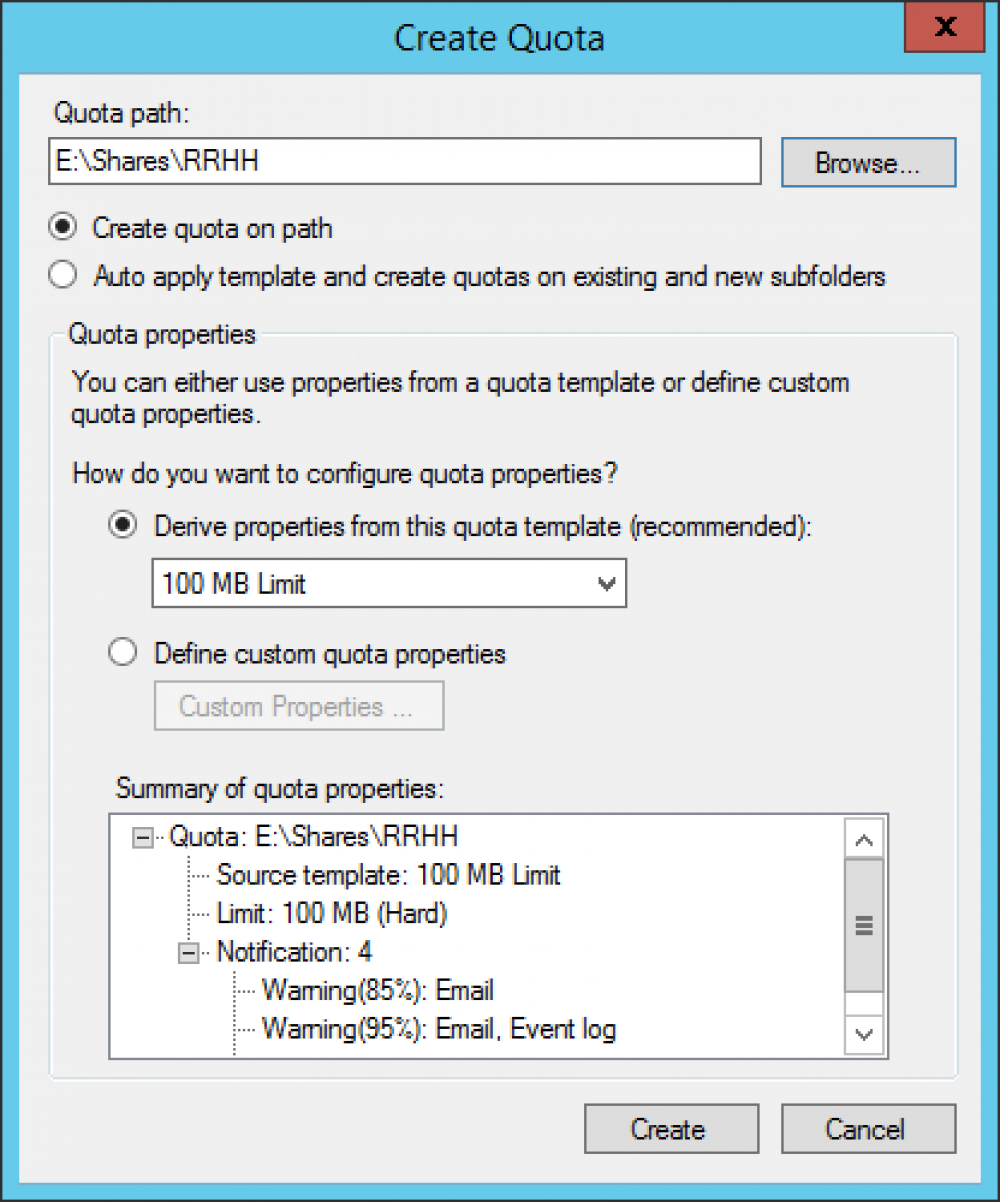 En la ventana Create Quota en el campo Quota path ingresar la ruta local a la carpeta donde se desea aplicar la cuota, luego seleccionar una plantilla de cuota desde el menú desplegable por ultimo presionar el botón Create.
