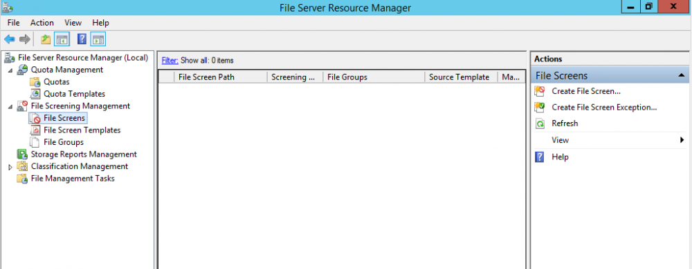 Para crear una regla de filtrado de archivos expandir el nodo File Screening Management luego hacer clic en File Screens por ultimo hacer clic en Create File Screen…