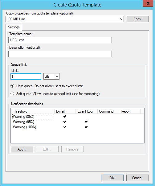 En la ventana Create Quota Template, especificar el nombre en el campo Template name luego en la sección Space limit seleccionar la unidad de medida y la cantidad de espacio por ultimo presionar el botón OK.