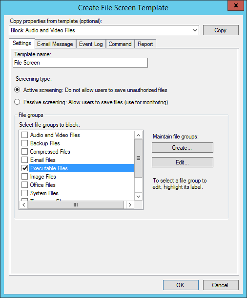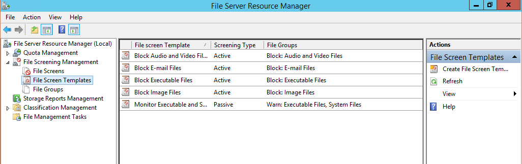 Expandir el nodo File Screening Management luego hacer clic sobre File Screen Templates, luego hacer clic sobre la opción Create File Screen Template…